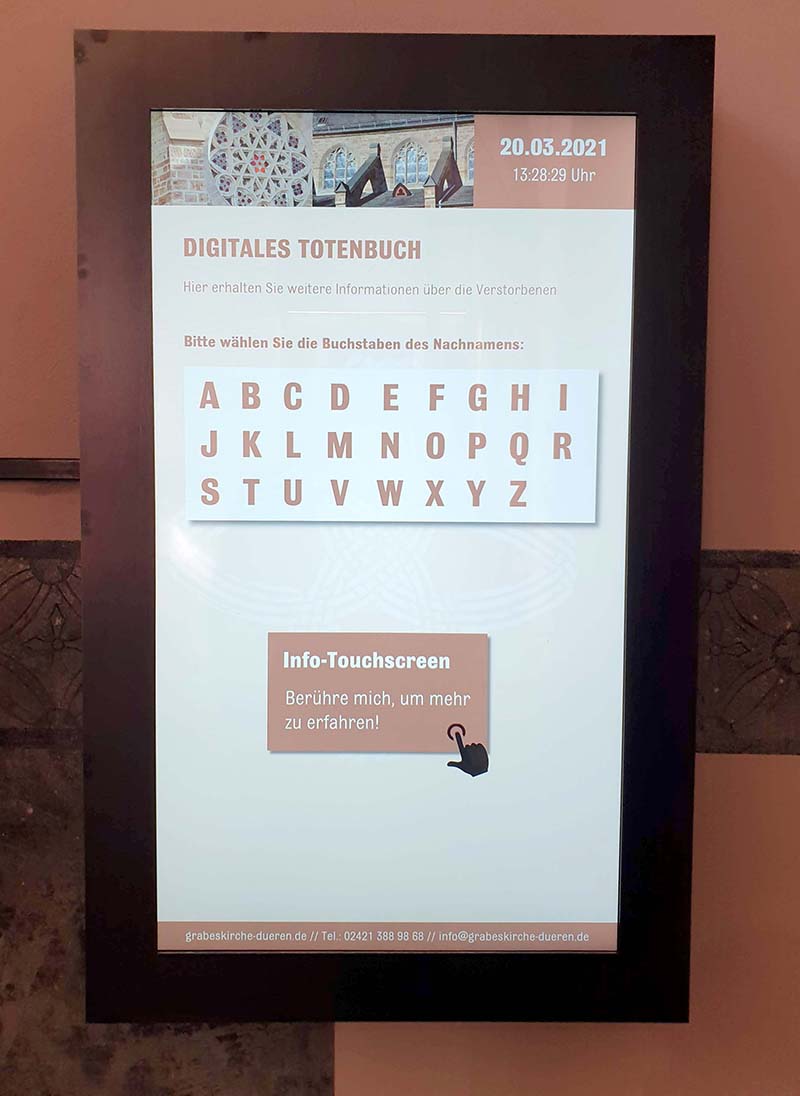 Seit geraumer Zeit existiert neben der anlogen Führung durch unsere Grabes- und Auferstehungskirche St. Cyriakus, auch ein sogenanntes „digitales Totenbuch“ im Turmbereich der Kirche an der linken Wand.