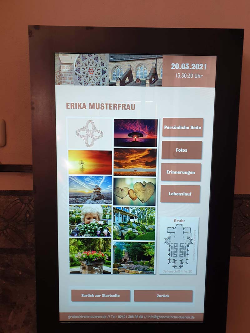 Dort können alle Besucher durch sehr einfaches Antippen und Scrollen den Namen eines Verstorbenen suchen und erhalten Informationen über die betreffende Person. Dies wird von den Angehörigen eines Verstorbenen individuell gestaltet: So kann neben einem oder mehreren Fotos, auch ein Lebenslauf, Anekdoten aus dem Leben oder auch Geschichten und Texte, die in Zusammenhang mit der Verstorbenen / dem Verstobenen stehen, niedergelegt werden. Angehörige, die dies wünschen, wenden sich an die Geschäftsführerin der Grabes- und Auferstehungskirche, Frau Elisabeth Hirt, senden ihr die nötigen word-Dateien per E-Mail zu oder speichern daheim die geplanten Dateien auf einem Stick und übergeben diese – unter Hinterlegung einer Unterschrift zum Einverständnis der Veröffentlichung, damit diese im digitalen Totenbuch eingepflegt werden können.