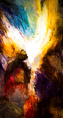 Dazu schreibt die Künstlerin: „In den Spuren der Engel wird göttlicher Trost erfahrbar, der die Menschen von innen erleuchtet."
